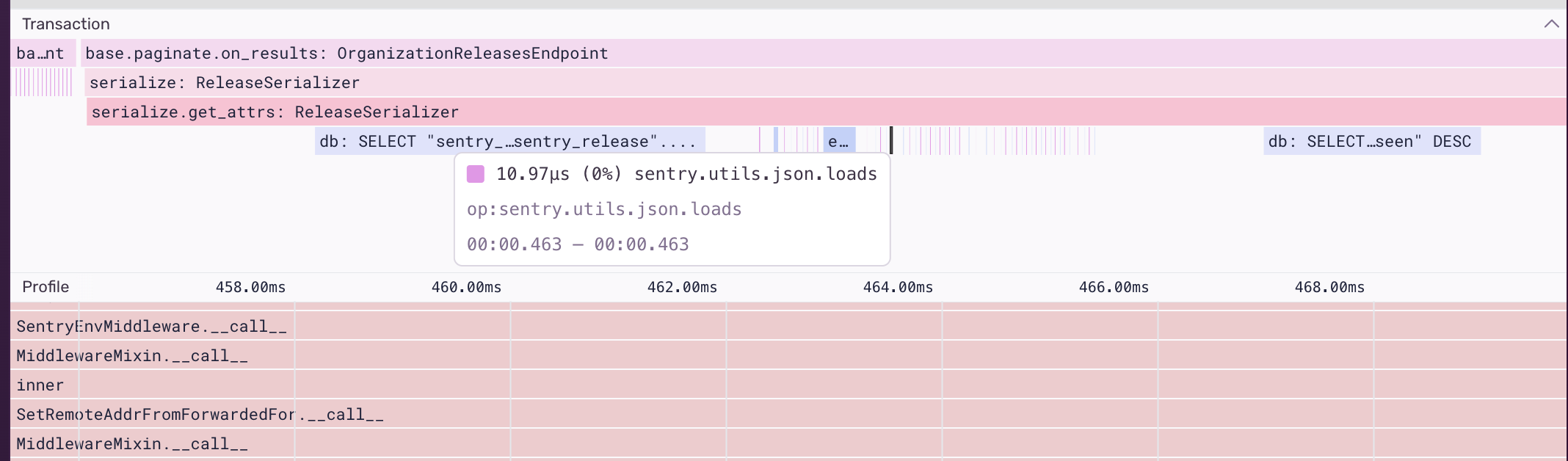 The “Transaction” section below the “Minimap” renders a tree of spans. It's the same view shown on the performance waterfall chart, but condensed to minimize white space. This view is helpful for cross-referencing profiler stack frames with span data.